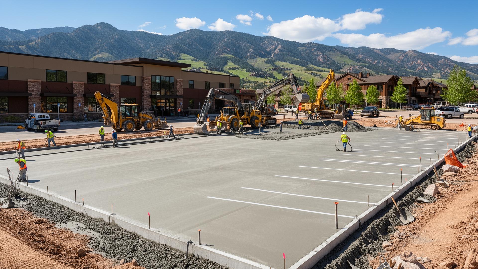 Parking lots, building foundations, sidewalks, curb and gutter, and commercial flatwork — built to commercial spec and local code throughout Western Colorado.
